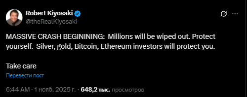 Ранее Кийосаки уже выступал с аналогичным предупреждением вскоре после резкой распродажи криптовалют, которую спровоцировали новые пошлины США на товары из Китая. Тогда после объявления о введении 100-процентных пошлин биткоин упал с отметки $122,000, и за несколько часов было потеряно почти $19 млрд на позициях с кредитным плечом. Кийосаки назвал этот хаос ещё одним доказательством финансовой нестабильности.